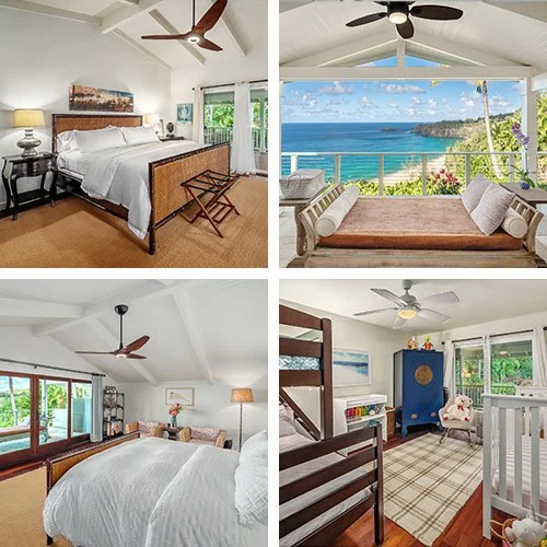 With 7 bedrooms and a brand new nursery for your baby and keiki, your guests and family members may never want to leave. We offer five king bedrooms, and 2 queen bedrooms. five of the seven bedrooms offer full in - suite bathrooms. This estate is the ultimate in luxury with high thread count sheets and impeccable amenities. The beautifully appointed bedrooms are designed to embrace Hawaiian culture with a modern twist.